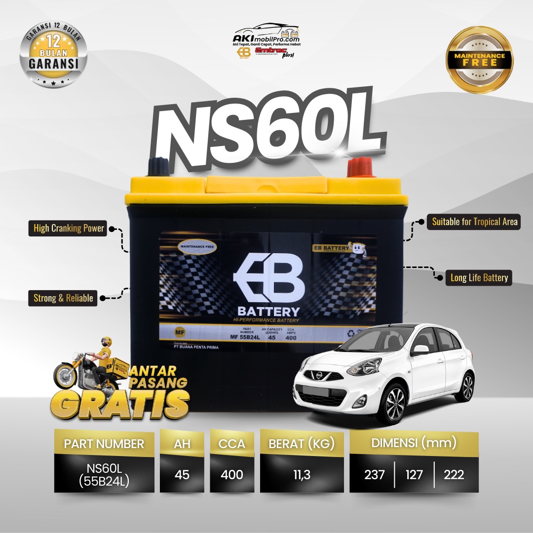 Aki Kering EB NS60L (55B24L) adalah solusi daya terbaik untuk mobil keluarga tipe sedan dan hatchback. Berbeda dengan tipe NS60 biasa, tipe NS60L ini memiliki terminal positif di sebelah KIRI (L). Menggunakan teknologi Valve Regulated Lead Acid (VRLA), aki ini menjamin performa kelistrikan stabil tanpa perlu perawatan air aki seumur hidup.