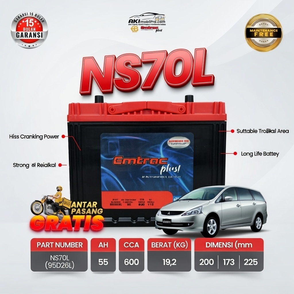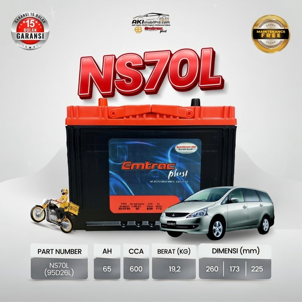 Aki Kering Emtrac NS70L (95D26L) adalah varian “Heavy Duty” dengan posisi kutub positif di sebelah KIRI (L). Aki ini dirancang untuk menjawab keluhan pemilik SUV dan Sedan besar yang merasa aki standar bawaan pabrik (biasanya tipe 65D26L) kurang awet atau kurang bertenaga.