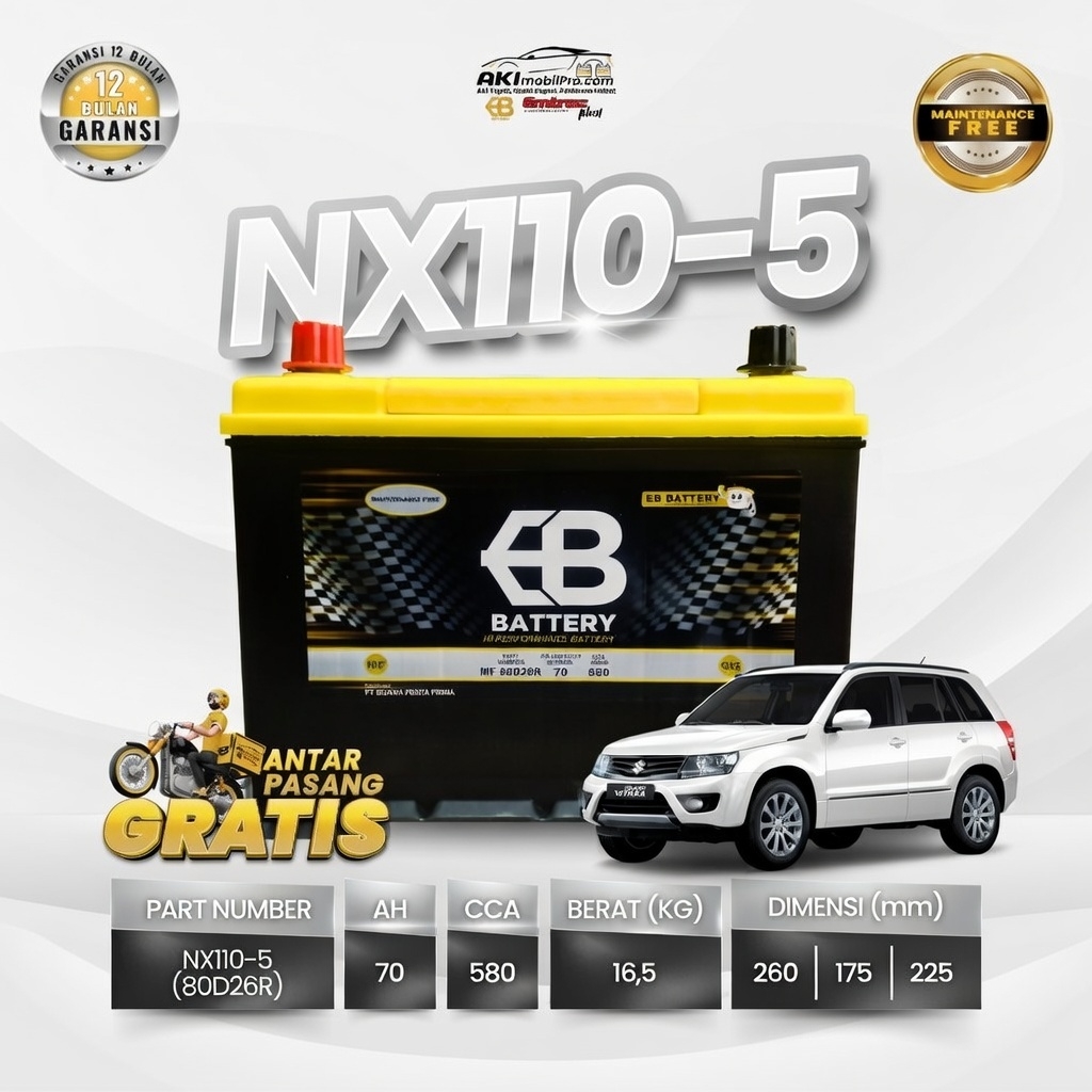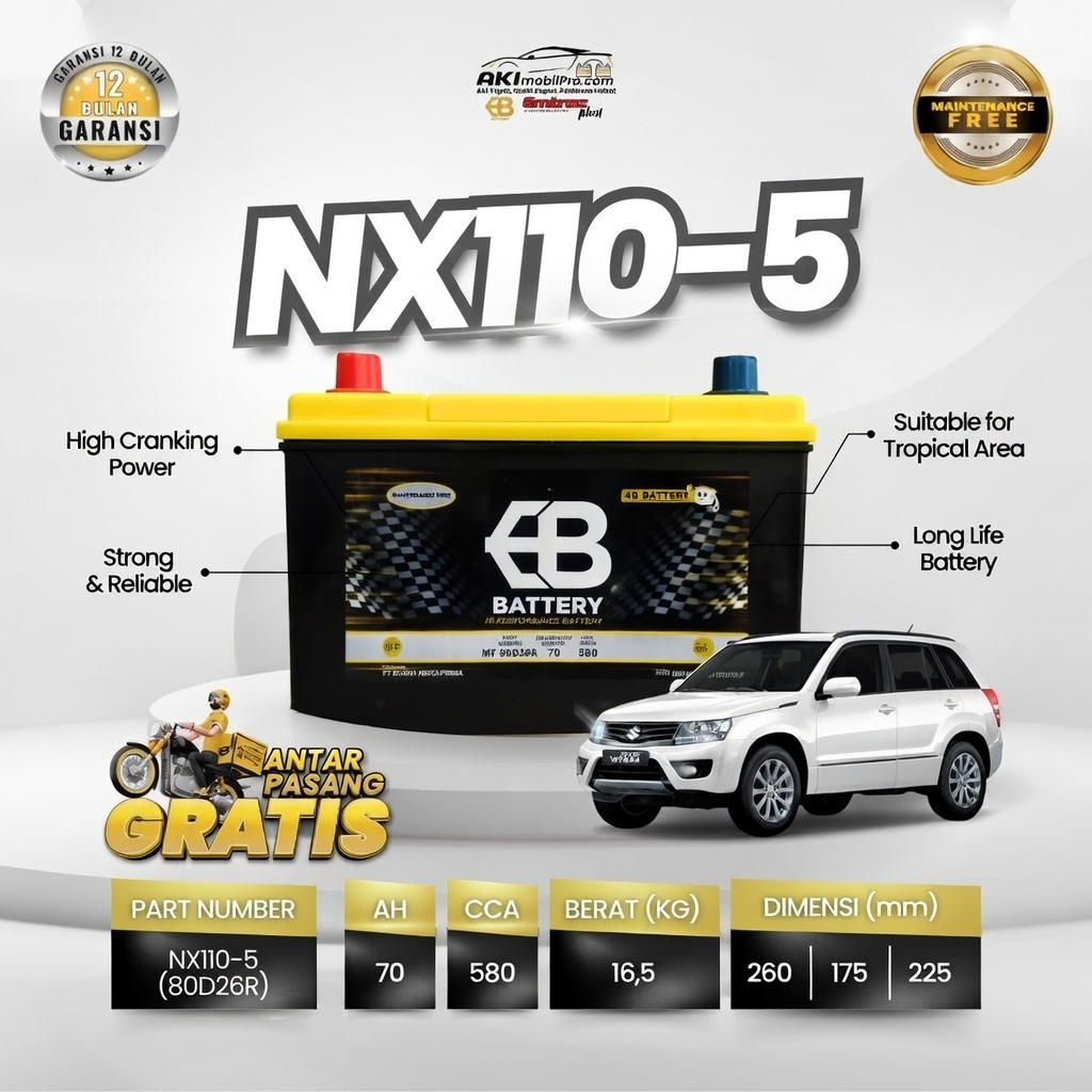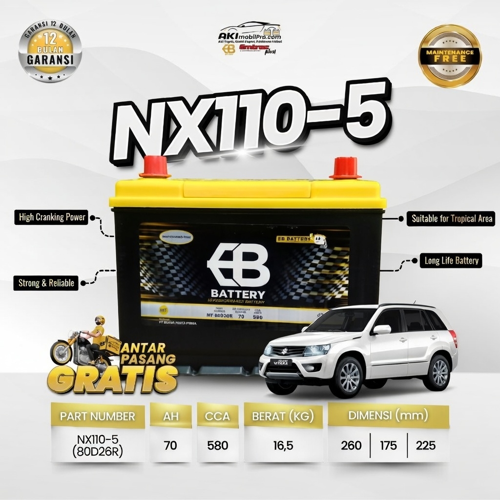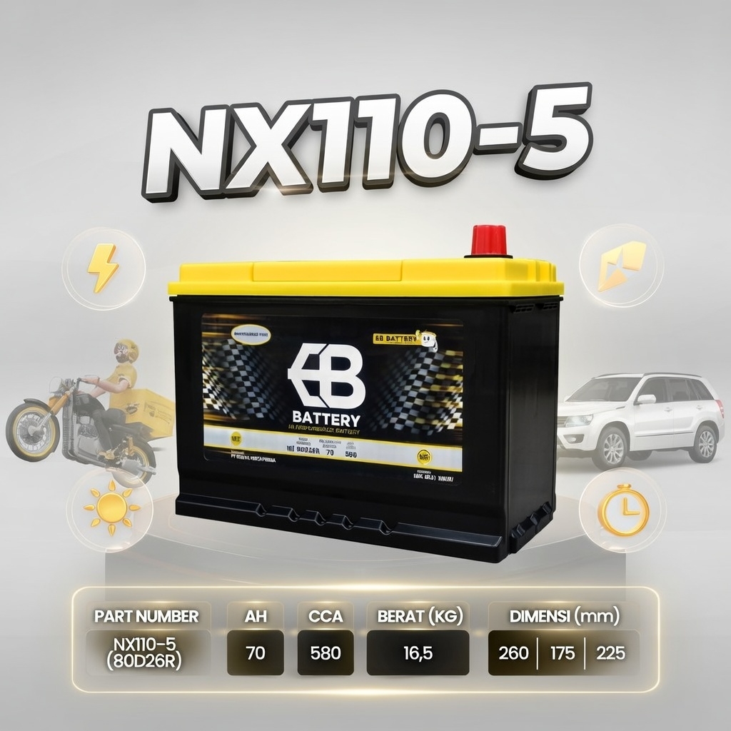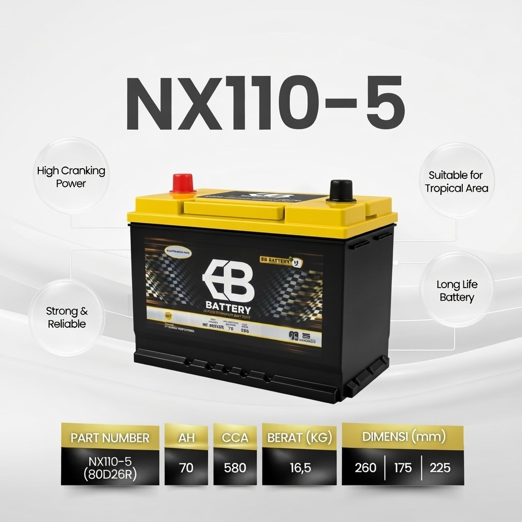 Aki Kering EB NX110-5R (80D26R) adalah solusi premium untuk “Sang Raja Diesel”. Jika Anda merasa aki tipe N50Z (60Ah) atau NS70 (65Ah) biasa kurang bertenaga untuk menyalakan mesin diesel lawas Anda, inilah saatnya upgrade. Aki ini menawarkan kapasitas murni 70 Ampere Hour (Ah) dengan CCA 580 Amps, angka yang sangat tinggi di kelasnya.