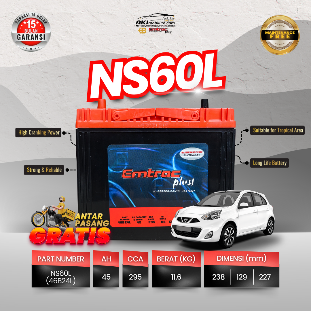 Emtrac Battery NS60L (46B24L) adalah aki kering premium dengan spek “Badak”. Bobotnya mencapai 11,6 Kg (terberat di kelasnya), menjamin pelat timbal lebih tebal, tahan panas, dan umur pakai lebih panjang dibanding aki standar.
