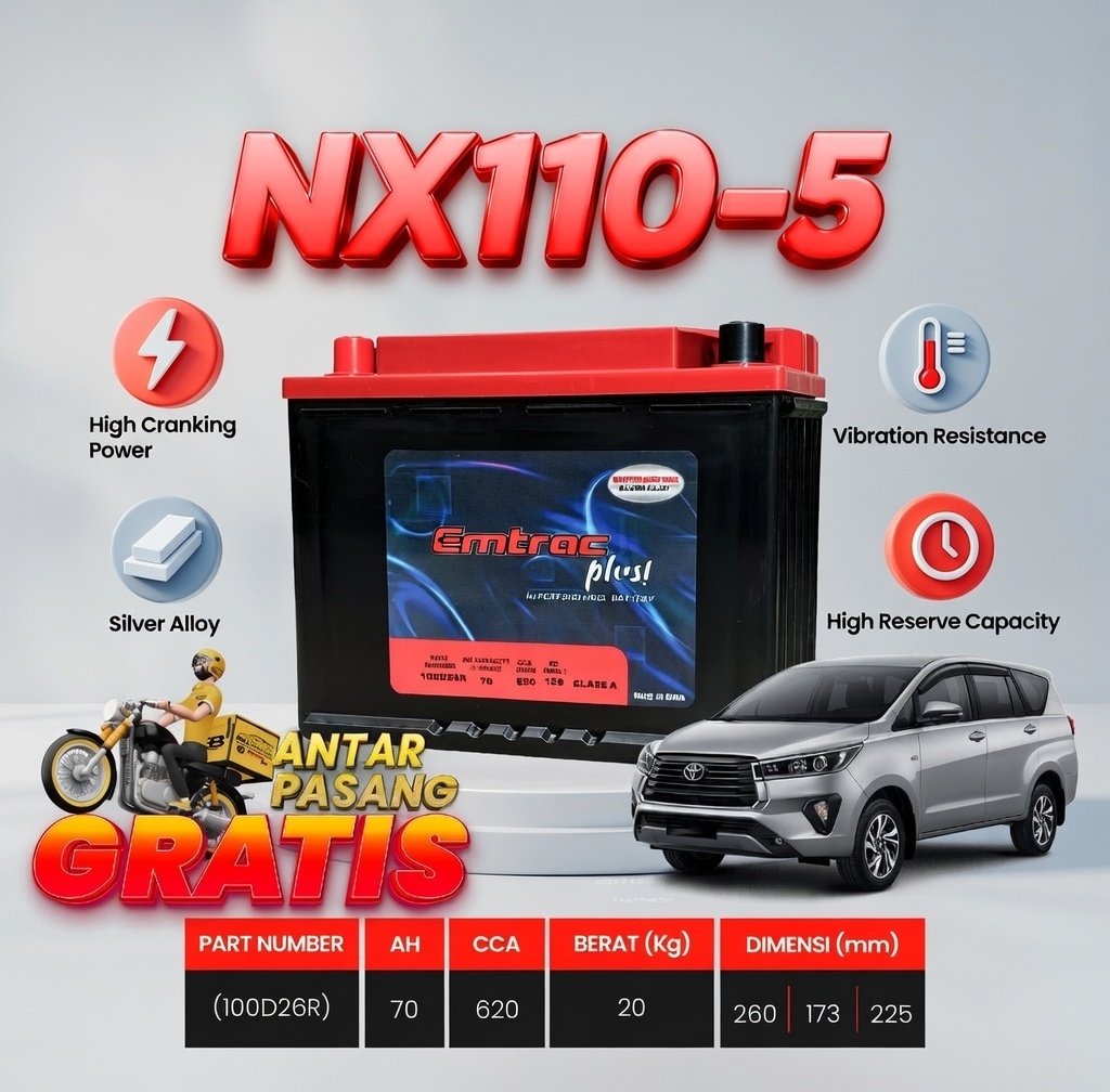 Aki Kering Emtrac NX110-5R (100D26R) adalah definisi sesungguhnya dari performa Heavy Duty. Jika Anda mencari aki paling kuat, paling berat, dan paling awet untuk kendaraan niaga atau mesin diesel Anda, pencarian Anda berakhir di sini.